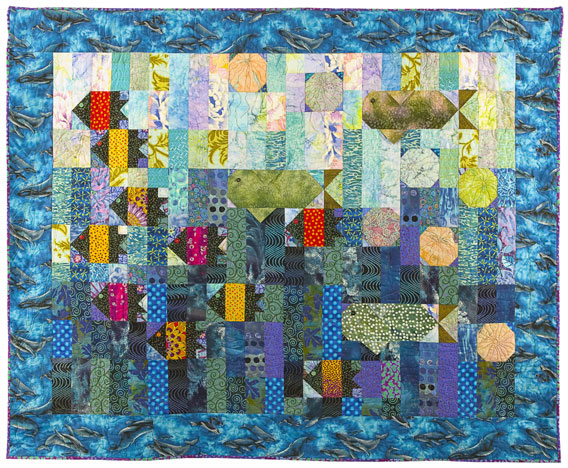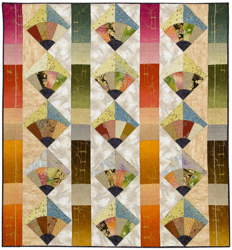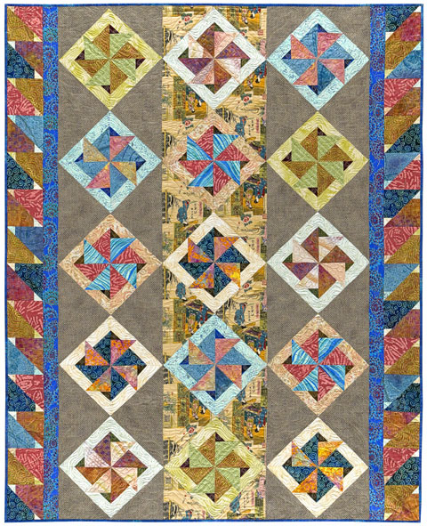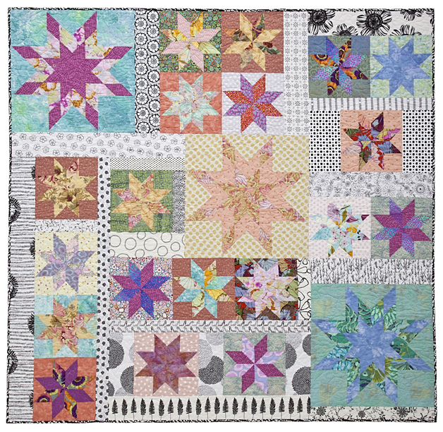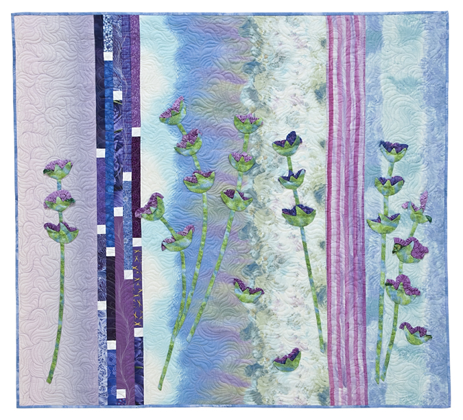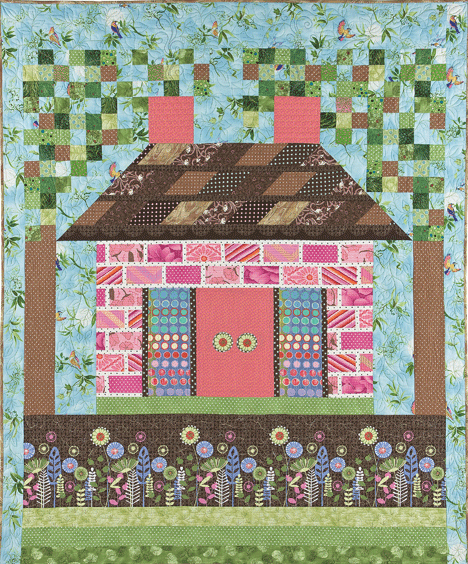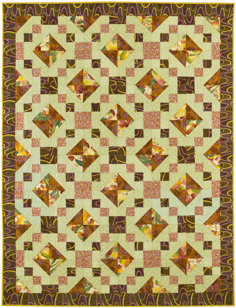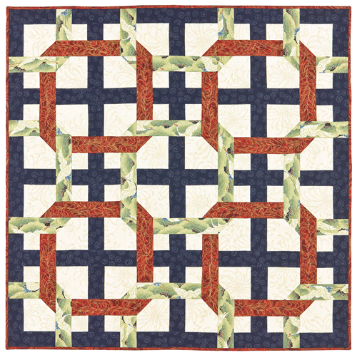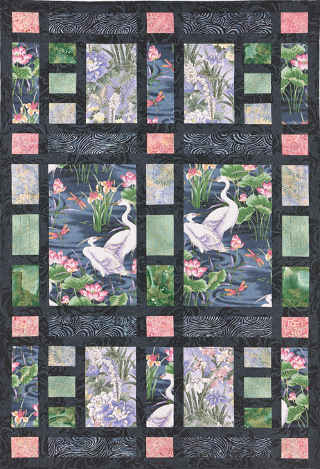This peaceful setting is achieved with simple strip piecing and fusible machine appliqué. Finished size 52-1/2" x 47" |