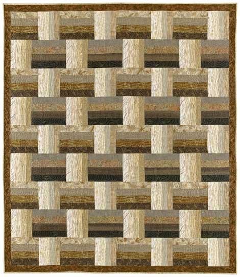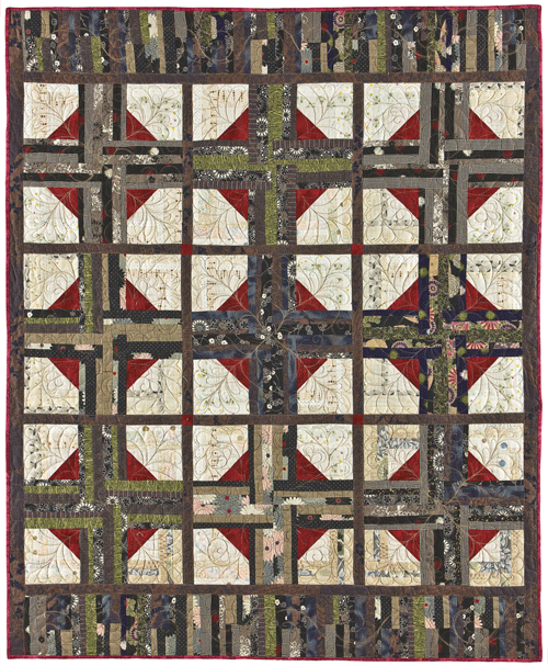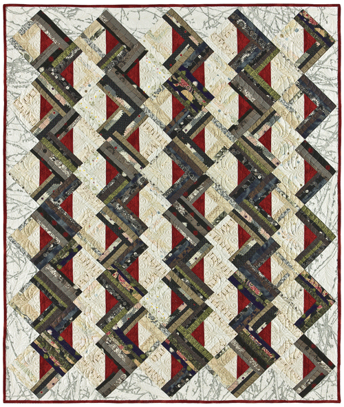 This traditional Log Cabin pattern takes on a new look with stripped logs and a diagonal setting. | Turn any quilt top into a quilted duvet. Insert your favorite puffy comforter, then join the top edges with a wide sashing woven through large curtain grommets which can be tied on the sides in knots or bows. | A dramatic yet easy interpretation of the Log Cabin pattern. Each log is strip-pieced, providing texture and dimension to the design. | |