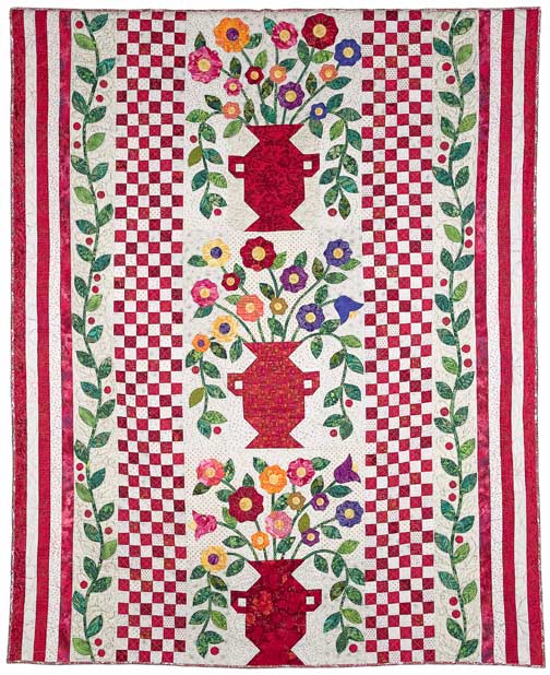 Large pieced urns overflow with an abundance of flowers, vines and leaves. Easy piecing and simple shapes with raw edge machine appliqué make this an appropriate pattern for any experienced beginner.