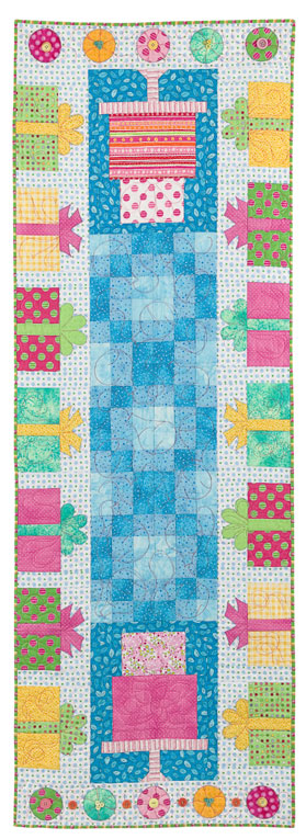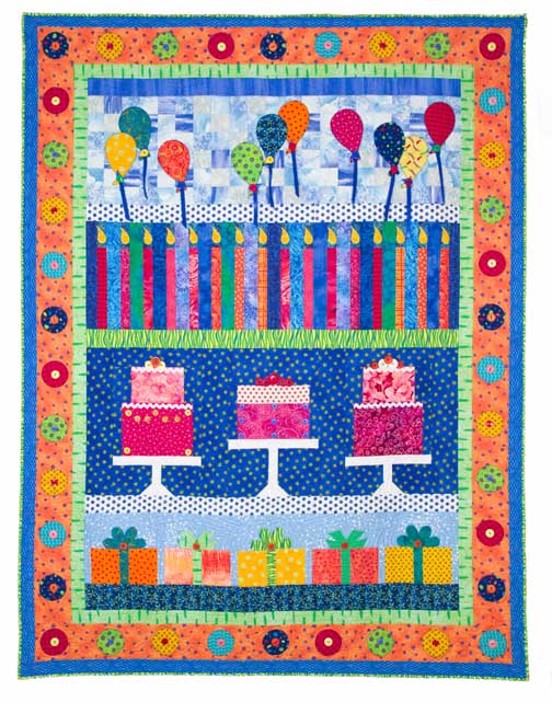 Make this exciting and colorful keepsake quilt for any special day. Start with quick-pieced blocks and easy appliqué shapes then embellish with rick-rack, ribbons and buttons to create a lively, one of a kind celebration quilt. Appropriate for any experienced beginner. Finished size is 56" x 73" |