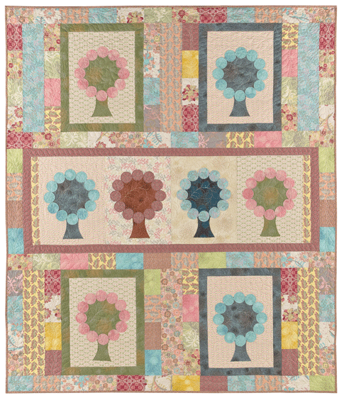 Whimsical and easy to appliqué trees are framed and set in rows with beautiful pieced sashing strips. Full-size template patterns are provided so you can use your preferred method of appliqué. Instructions for four quilt sizes are included. Finished size is 60” X 72” |
