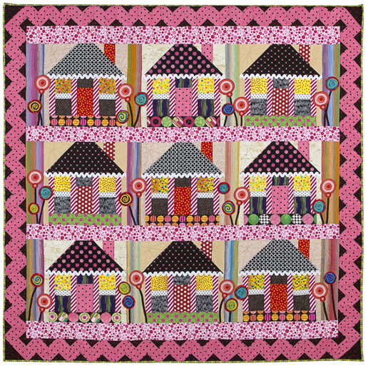 A village of brightly colored pieced houses trimmed with candy canes and lollipops. Finished size is 64" x 64" |